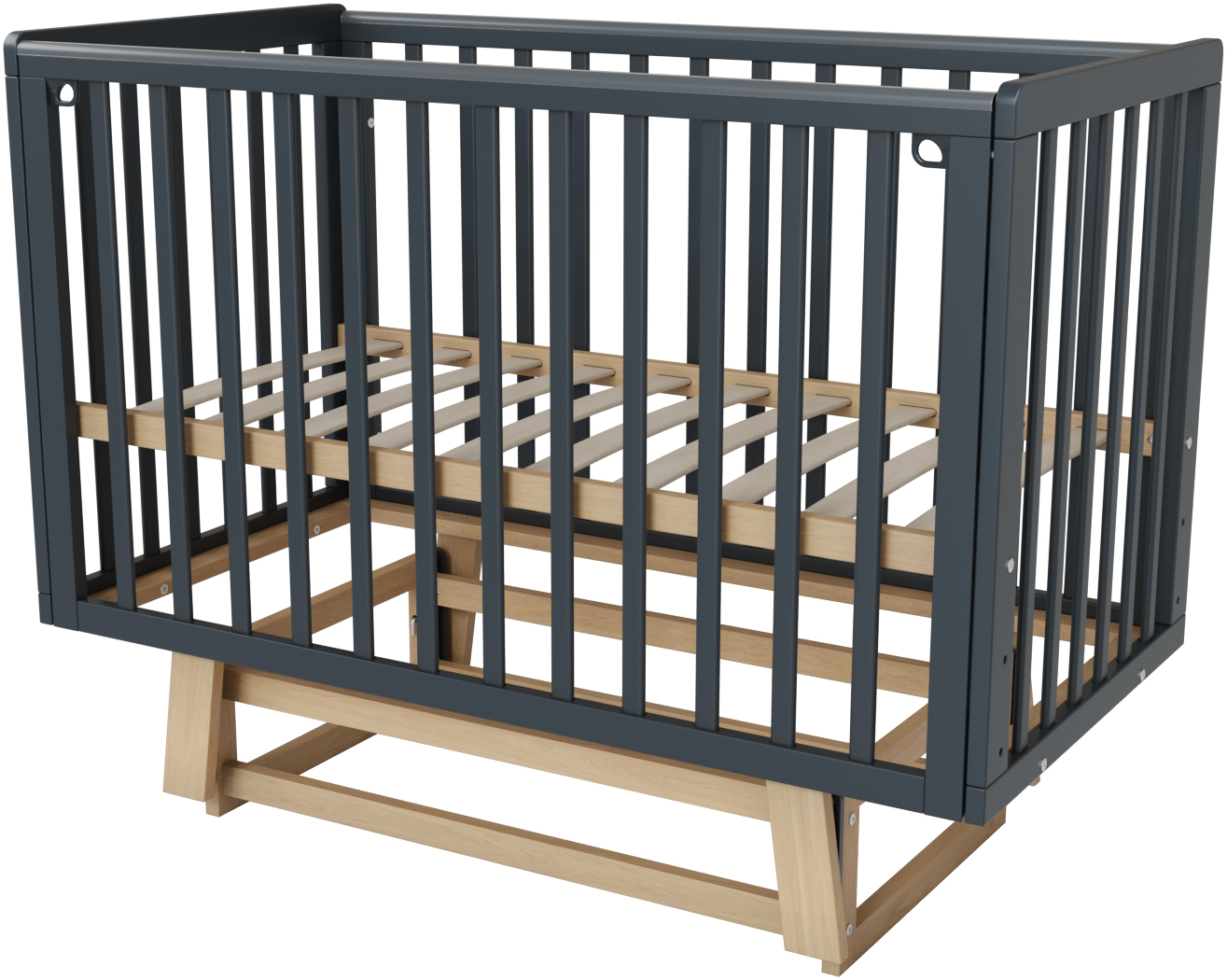 Основание кровати имеет четыре положения регулировки высоты дна, обеспечивая удобство ухода за ребенком на каждом этапе развития: верхнее положение удобно для новорожденных, среднее предназначено для малышей, начинающих активно двигаться, а нижнее подойдет для тех, кто уже пробует вставать на ноги.