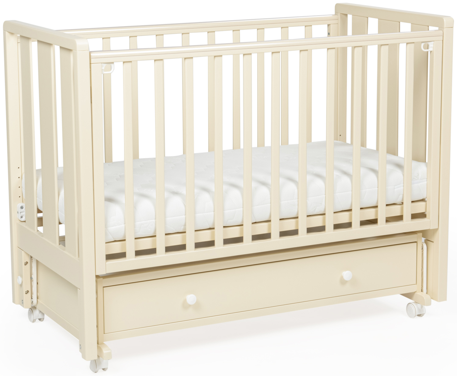 Боковая стенка опускается плавно и бесшумно с помощью фиксатора-курка. Боковую стенку можно снять полностью, превратив кроватку в уютный диванчик или приставную кровать для совместного сна. На боковых стенках предусмотрены ПВХ-накладки.