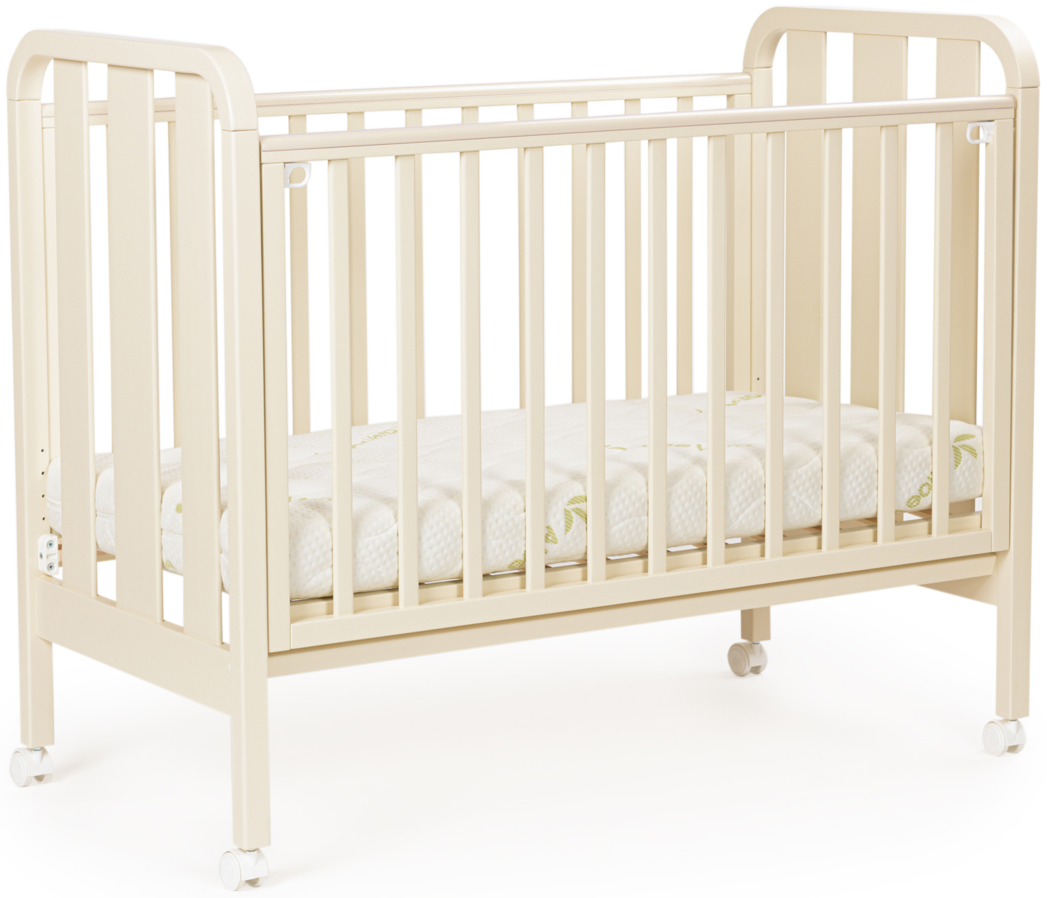 Для удобства родителей основание кроватки фиксируется в пяти различных положениях по высоте, а боковая стенка легко поднимается и опускается.