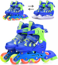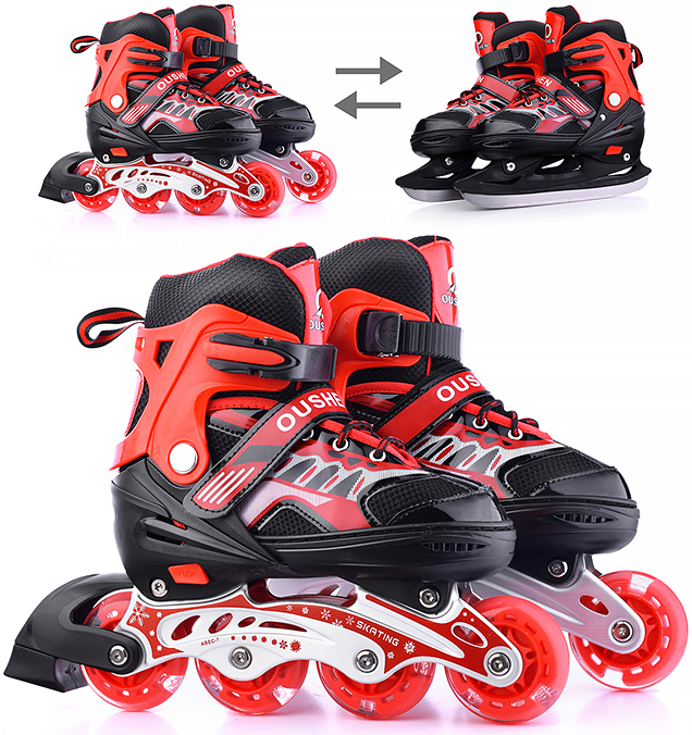 Благодаря комплектующемуся сменному шасси летние роликовые коньки легко превращаются в зимние ледовые коньки путем замены лезвий на колесную базу.