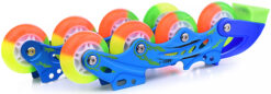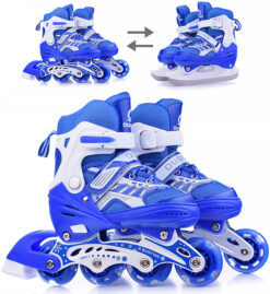 Благодаря комплектующемуся сменному шасси летние роликовые коньки легко превращаются в зимние ледовые коньки путем замены лезвий на колесную базу.