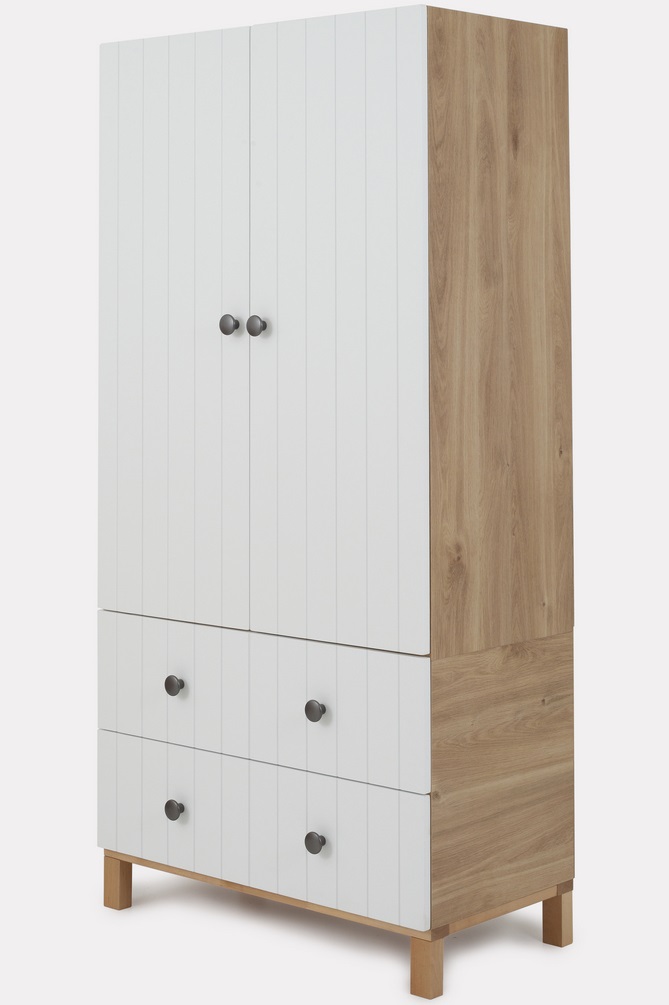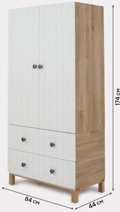 Сочетание основного цвета с трендовым оттенком дерева позволит гармонично вписать шкаф в большинство интерьеров.