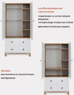 Объемное отделение с двумя штангами для плечиков и полочкой, четыре ряда полок и пара вместительных выдвижных ящиков помогут разместить все вещи малыша в одном месте. Внутри объемного отделения и штанги, и полка могут быть установлены на оптимальной для вас высоте.