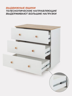 Три больших тихих выдвигающихся ящика оснащены прочными телескопическими механизмами, выдерживающими длительные нагрузки.