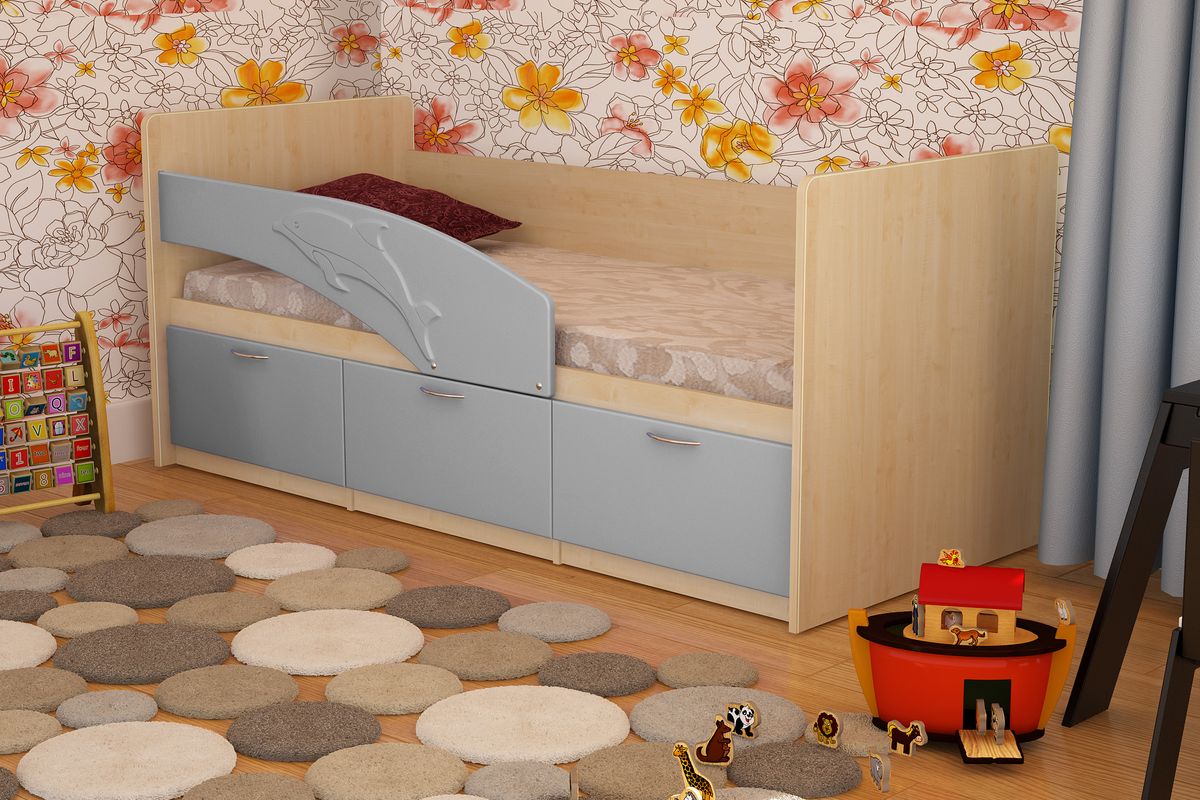 Детская кровать «Дельфин» имеет весьма оригинальную конструкцию и высокую функциональность. Передняя и задняя и правая стенки имеют значительную ширину и способствуют усилению жесткости конструкции всей кровати. Левая стенка имеет овальную форму, украшенную орнаментом плывущего дельфина. Кровать имеет специальные ящики, для хранения личных вещей Вашего ребенка.