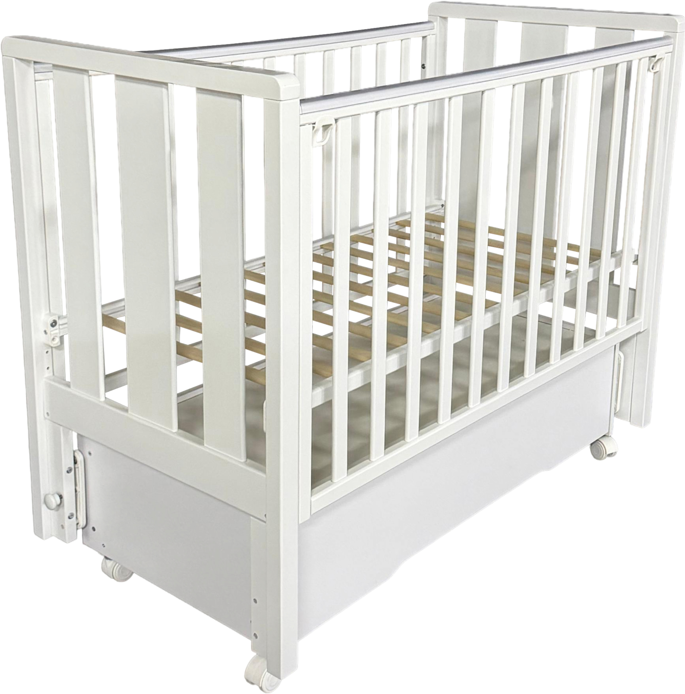 Основной особенностью кроватки является наличие универсального маятникового механизма, позволяющего плавно укачивать ребенка мягкими колебательными движениями. Во время сборки Вы можете выбрать удобный способ укачивания — поперечный или продольный, в зависимости от предпочтений Вашего малыша. При желании возможность укачивания легко отключается специальным фиксирующим устройством.