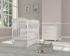 - Высокоглянцевое покрытие поверхностей кроватки защищает кожу малыша от травмирования;