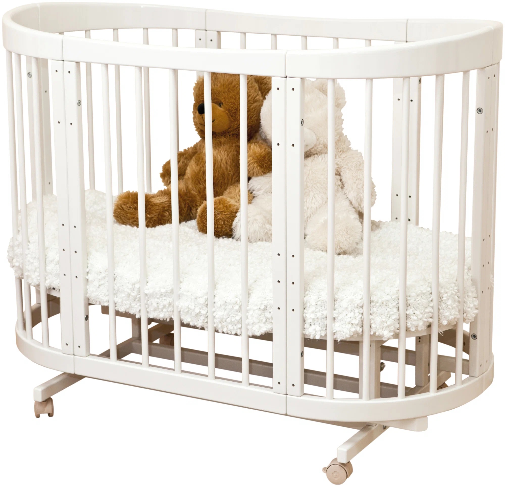 - Боковые планки овальной кроватки сделаны не плоские, а круглые, что позволяет развивать хватательный рефлекс и вестибулярные навыки ребенка;