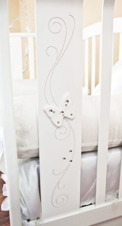 Каркас кроватки украшен резьбой и декоративными бабочками.