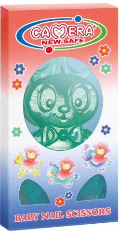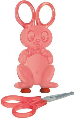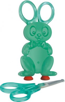 - Хранятся ножницы в пластиковом футляре-подставке, выполненном в виде забавного зайчика;
